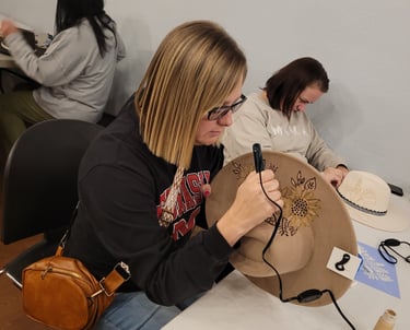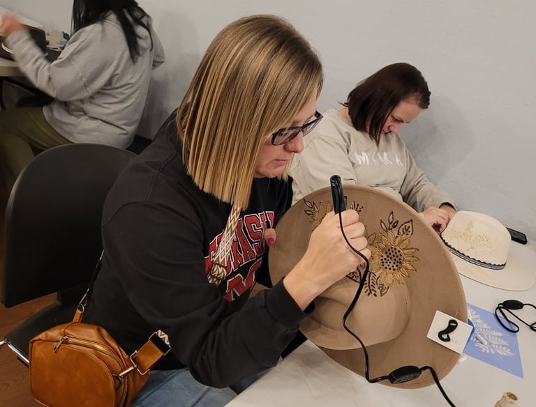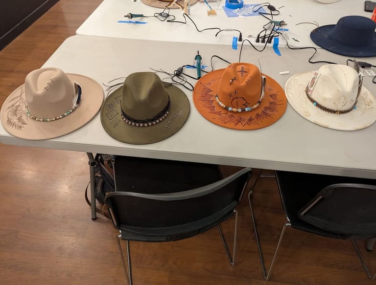 Venture into the world of pyrography - where art meets fashion! Choose from a variety of hats and embellishments. Learn different techniques for hat burning and get hands on with your wardrobe!