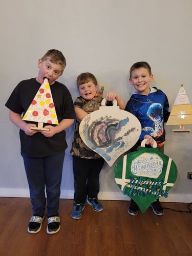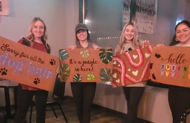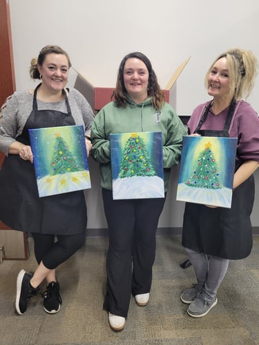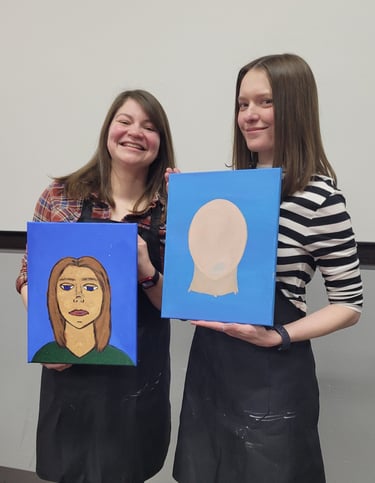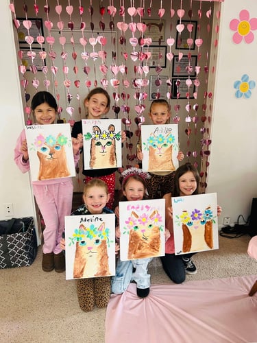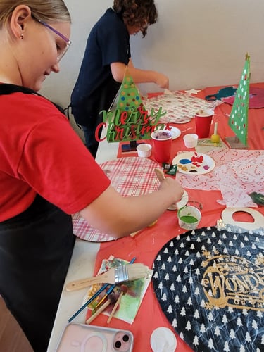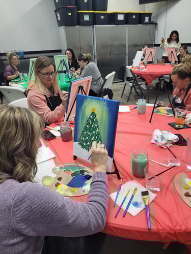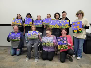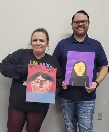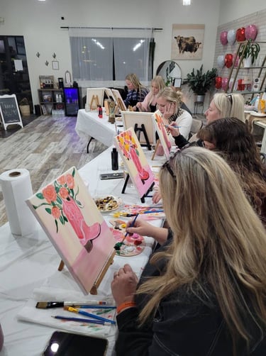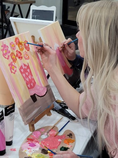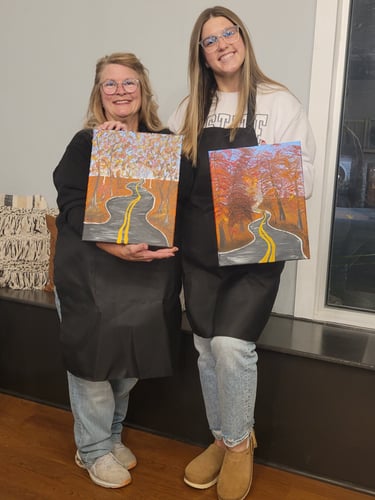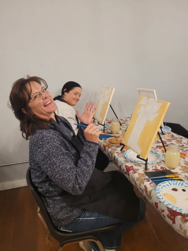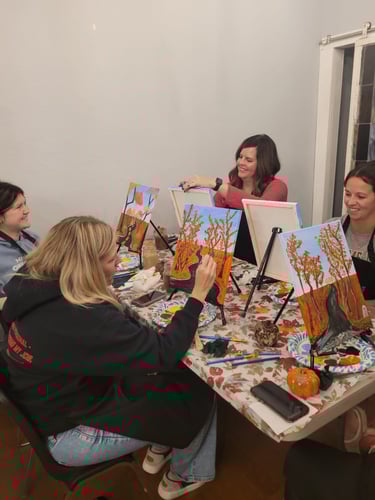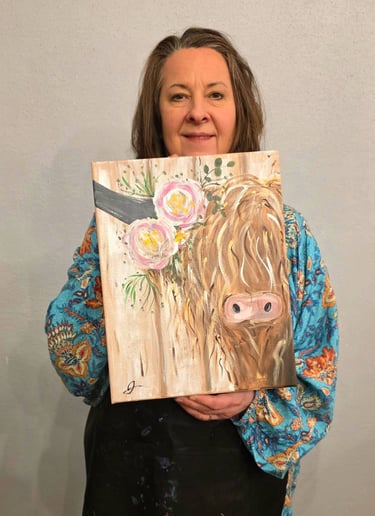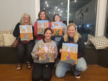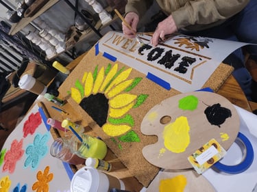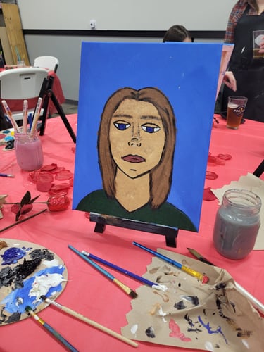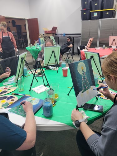 A creative studio space with a painting on an easel. The painting features bright, abstract colors and a surreal scene with a ship and large wheel. The room contains a black office chair with a red cushion, surrounded by various art supplies and multiple finished and unfinished artworks. The background has dark cabinets and some cluttered surfaces.