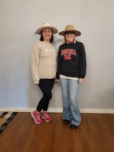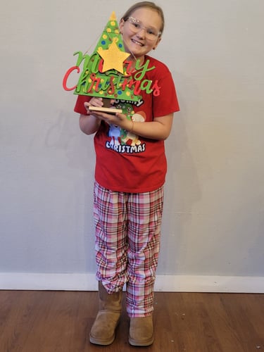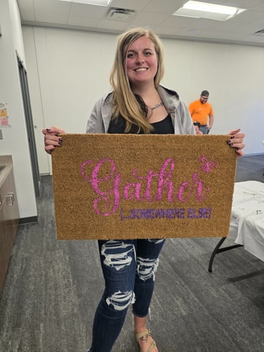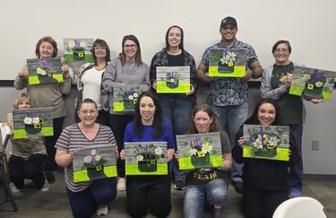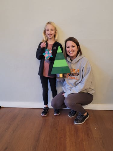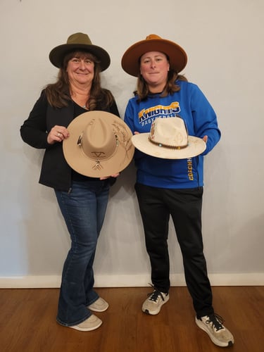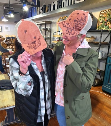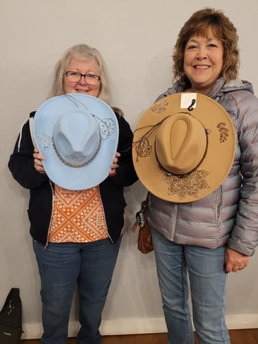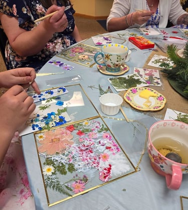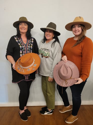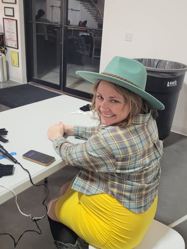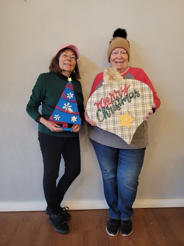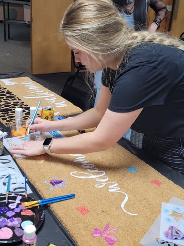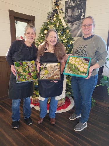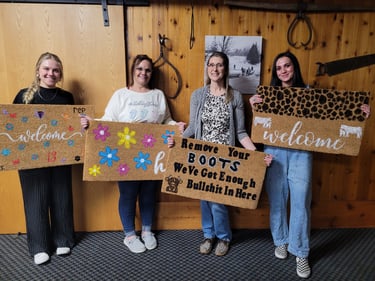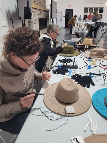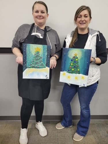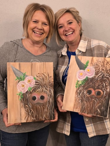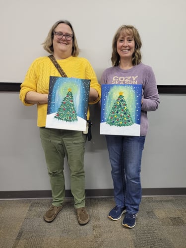A creative studio space with a painting on an easel. The painting features bright, abstract colors and a surreal scene with a ship and large wheel. The room contains a black office chair with a red cushion, surrounded by various art supplies and multiple finished and unfinished artworks. The background has dark cabinets and some cluttered surfaces.